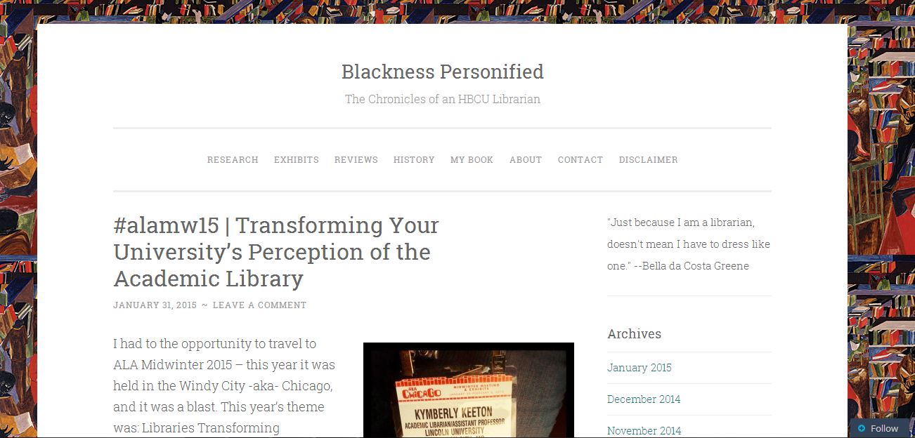 First-year librarian, kYmberly Keeton at Lincoln University – MO has created a new blog to document her experiences as an Academic Art Librarian and Assistant Professor. The blog features her work in information literacy, public art programming, and presentations. As an HBCU Librarian, Keeton states that she wants to highlight the ups and downs in her career and to continue the legacy of several writers at Lincoln University that made a major difference. “I believe that it is imperative to show through writing and visual depictions of what I go through as a librarian with the world. My first blog,Digibooklibrarian was a major success and received national awards while I was in graduate school, and I hope that this new initiative will receive the same amount attention in my profession.”