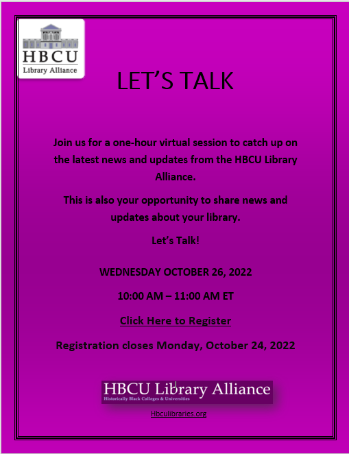 Members, please join the Board of Directors on Wednesday, October 26, 10:00 ET for the inaugural Let's Talk virtual session. We look forward to providing information and updates on HBCU Library Alliance activities.