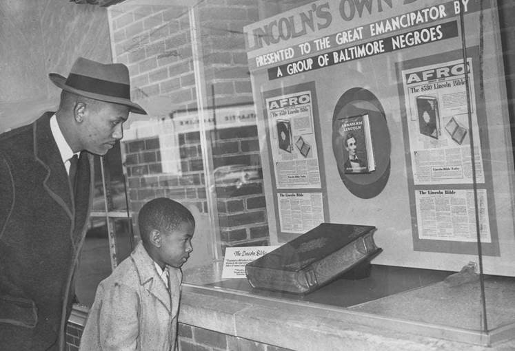A photograph of a man and his son looking at a display case in the library of Fisk University that ... [+]