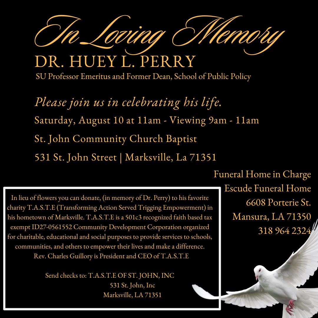 It is with heartfelt sympathy that I share with you the passing of Dr. Huey L. Perry, husband of Emma Bradford Perry a founding member of the HBCU Alliance. Join me in expressing words of comfort to Retired Library Dean Perry.