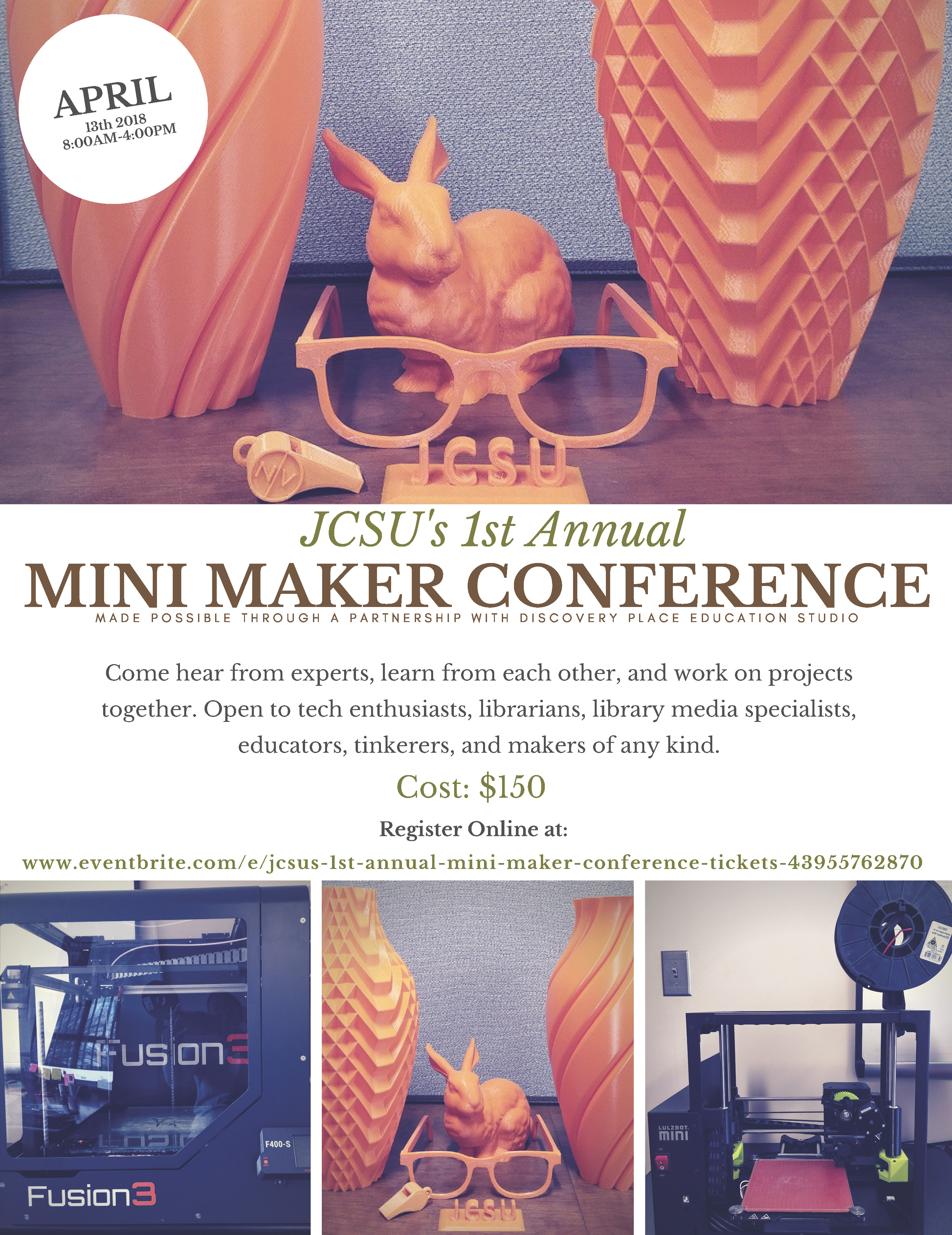 This event is open to all librarians, library board or foundation members, alumni, community members, CMS teachers and librarians. Anyone interested in learning more about makerspaces is invited. If you are an vendor, maker or librarian and would like to speak about your work please contact Dr. Chantell McDowell cmcdowell@jcsu.edumailto:cmcdowell@jcsu.edu