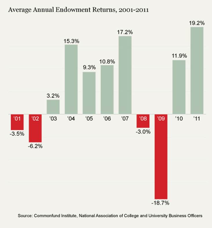 Endowments have been buffeted by the turbulent economic climate of recent years, with 2009 bringing a 19-percent drop in returns, followed by a 12-percent rise in 2010.